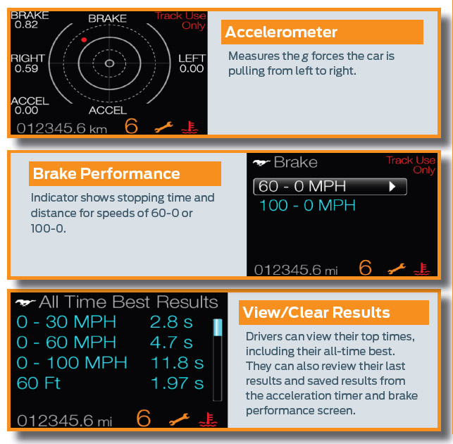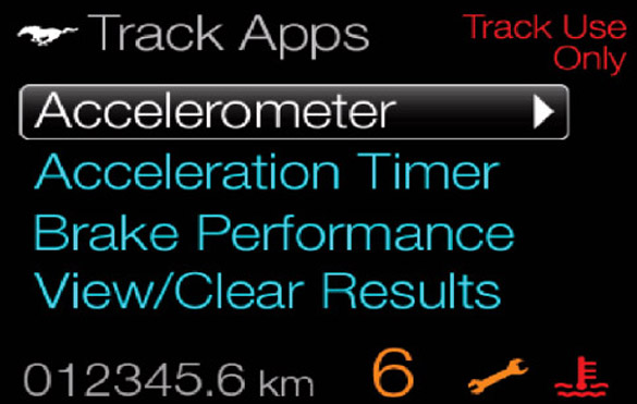 Unique to Mustang’s productivity screen is Track Apps, which delivers performance metrics for drivers who want to put their car to the test at the track.