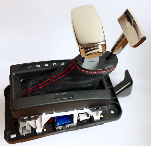 Ale jinak už mám dokončenou řadičku. Je teda základna nastříkaná na černo a udělané červené obšití a chtěl jsem ještě pochromovat ručku. U hliníku je to ale trošku problém a dělá to v ČR snad jenom jedna firma, kde jsou čekací lhůty i měsíce. Tak na vnuknutí od Johana jsem ten hliník zkusil rozleštit, což se mi i po čase a velkém úsilí povedlo. Chce to ale prax rozleštit hliník do zrcadla. Stejně jsem ale nebyl spokojen, ten hliník jak je měkkej tak je náchylnej na poškrábání a časem oxiduje tak jsem ho nakonec stejně nechal pokovit (mědí a pak niklem) a výsledek je tady: může se tedy instalovat do auta. (Fotka trošku zkresluje barvu pod umělým osvětlením, moc se to od chromu neliší)